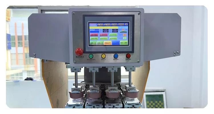 ஹெல்மெட்டிற்கான 4 கலர் பேட் பிரிண்டிங் மெஷின் கட்டுப்படுத்த டச் பேனல் பொருத்தப்பட்டுள்ளது