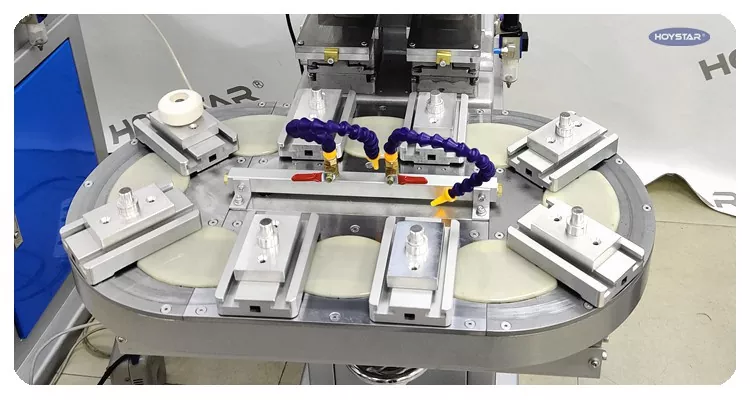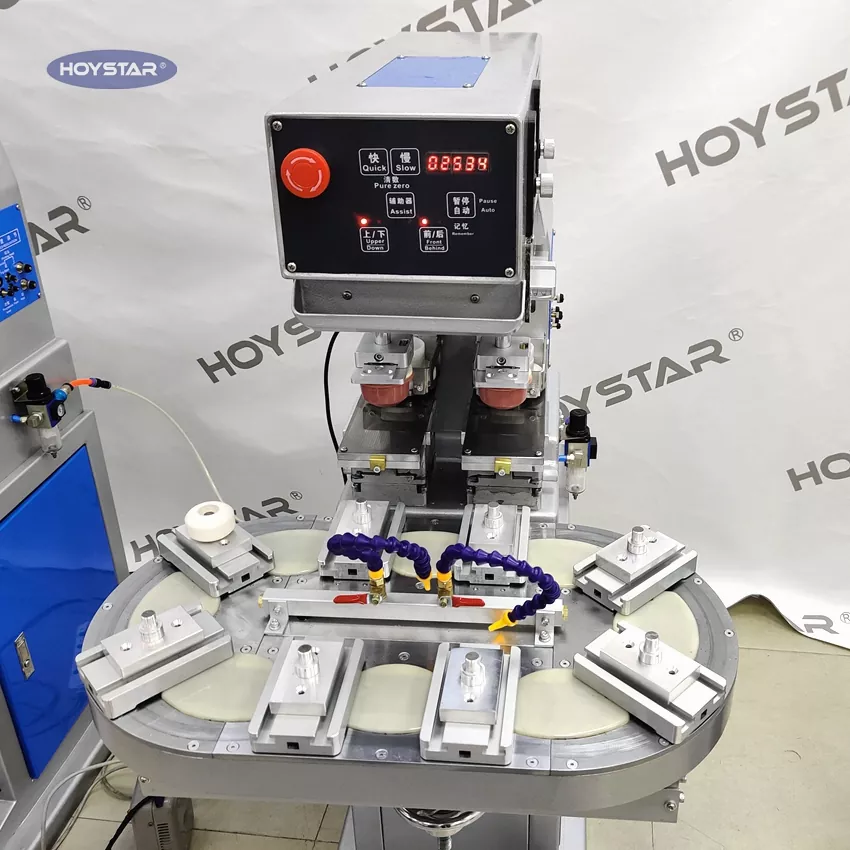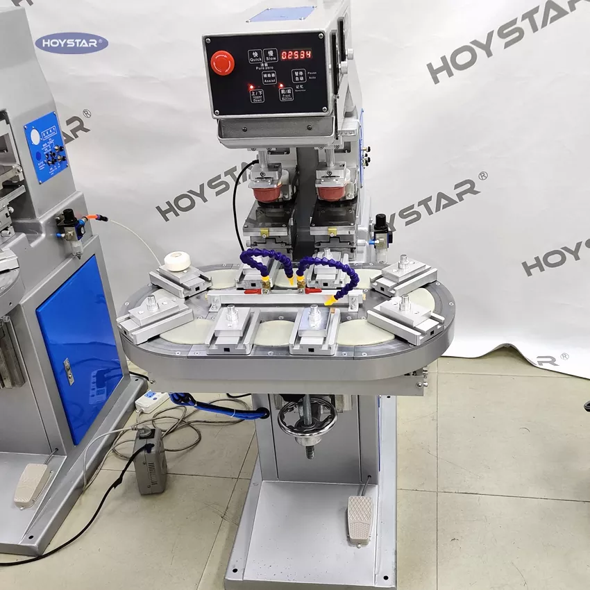 HOYSTAR சீனாவில் நம்பகமான உற்பத்தியாளர் மற்றும் சப்ளையர்; HOYSTAR டூ கலர் ரோட்டரி டேபிள் பேட் பிரிண்டிங் மெஷின் உயர் திறன் மற்றும் செலவு குறைந்த அச்சிடும் கருவியாகும். இயந்திரம் வசதியான சரிசெய்தல், நிலையான செயல்பாடு மற்றும் நல்ல அச்சிடும் விளைவை வழங்குகிறது. இயந்திரம் நிலையான அச்சிடும் தரத்தை வழங்குகிறது மற்றும் மின்னணு பொருட்கள், பிளாஸ்டிக் குண்டுகள், வன்பொருள் பொருட்கள், எழுதுபொருட்கள், சிறிய கலைகள் மற்றும் கைவினைப்பொருட்கள், அத்துடன் பரிசுகளின் மேற்பரப்பில் உள்ள சிறிய சின்னங்கள் மற்றும் பலவற்றை அச்சிடுவதற்கு ஏற்றது. வாடிக்கையாளர்களின் பல்வேறு வண்ண அச்சிடுதல் தேவைகளை பூர்த்தி செய்ய முடியும்.